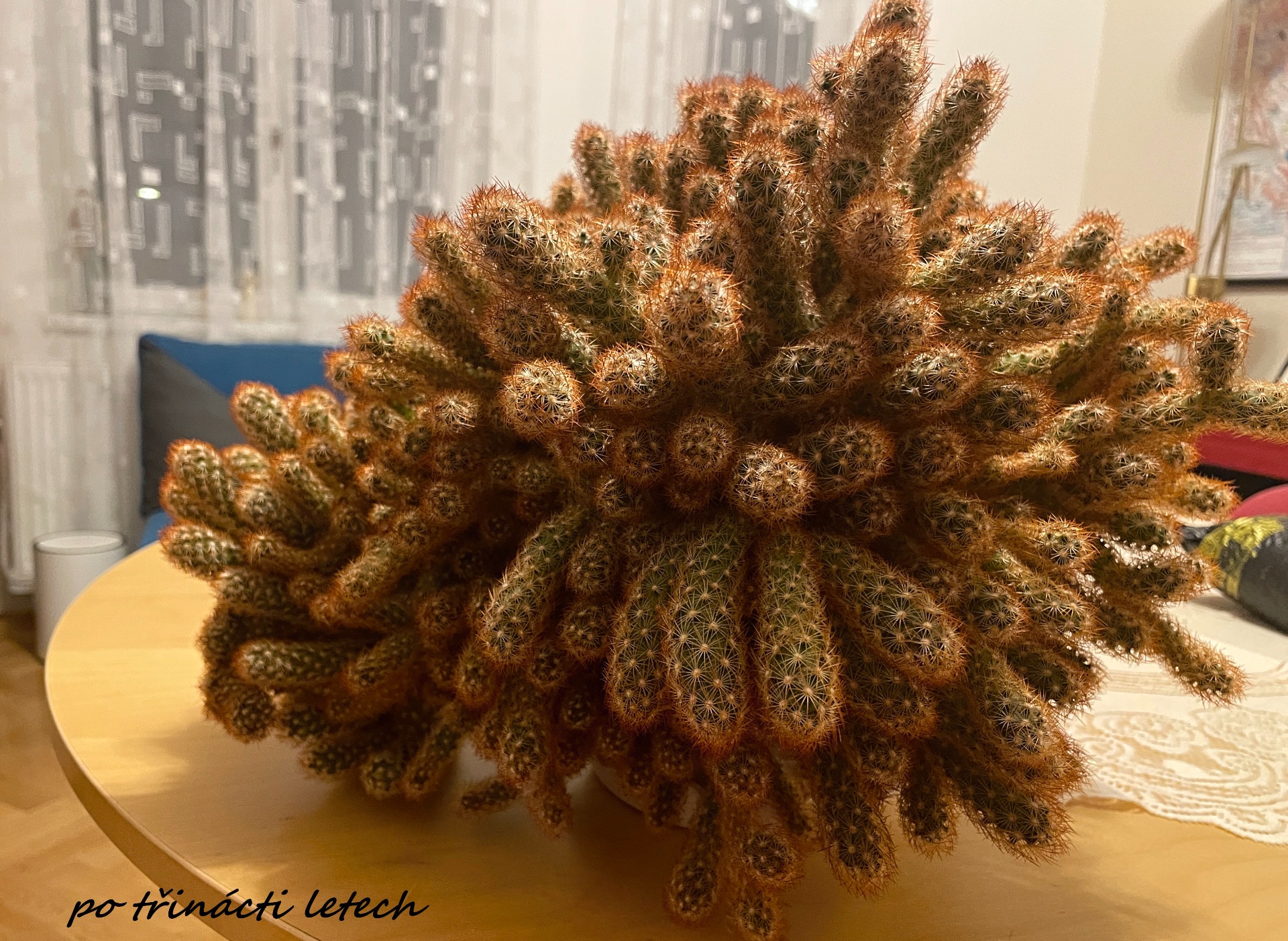 Milovaný kaktus. Tolikrát jsem se o něj popíchala... ale mám k němu zvláštní vztah. Dostala jsem ho k padesátinám od mladšího synka, takový to byl prťousek, a byl předzvěstí velké kytky, která dorazila po pár dnech. Fénix. Jenže u ne kytky moc nevydrží, fénix po pár letech v létě venku nějak ofoukl a zahynul. Kaktus rostl a rostl. Už se nevejde na parapet, aniž by trhal záclonu.