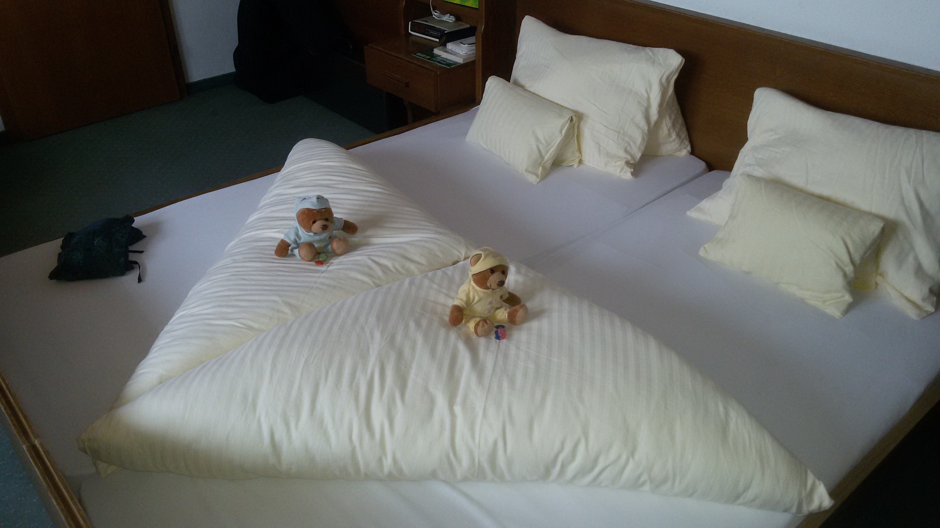 A tady jsou v nějakém hotelu, netuším, v kterém městě, a pokojská asi má smysl pro malé denní radosti a hezky nám ustlala a medvídky uložila... ne vždy se pokojské k našim bezejmenným medvídkům chovaly s takovou láskou!