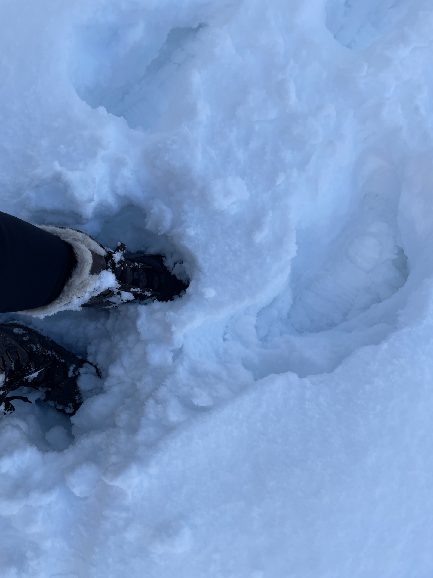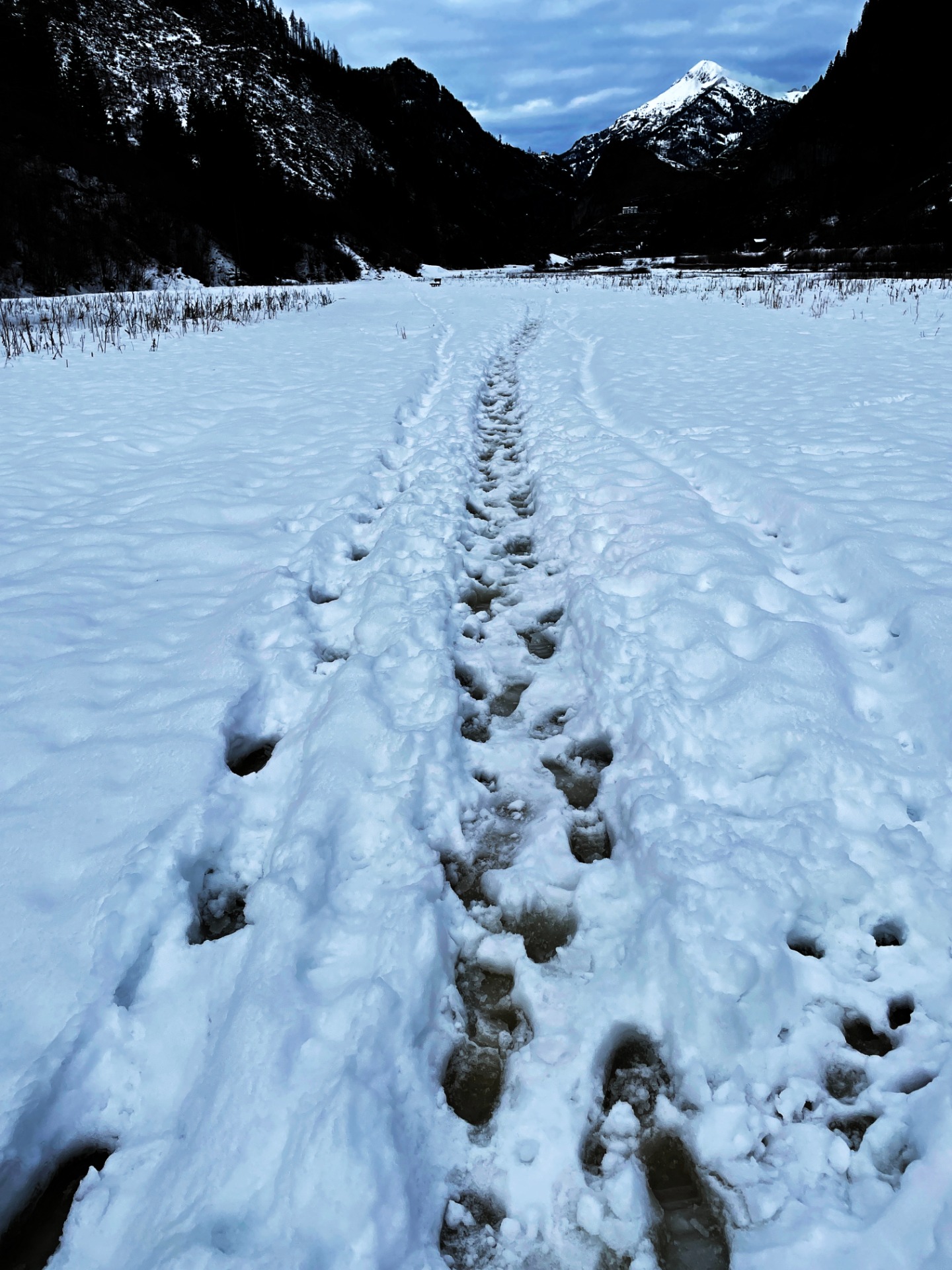 Opět jsem došla až do Caprile a statečně přecházím most a vracím se po druhé straně řeky. Ouha, měla jsem se vrátit a jít po slunné suché asfaltové cestě. Too much snow! Není to ledajaký sníh, byl měkký, bořivý, rozbředlý do velkých kaluží, které jsem musela přebrodit. Jak to, že v pondělí to šlo? Boty naštěstí vydržely, moje super Sorelky, chválila jsem je už loni.