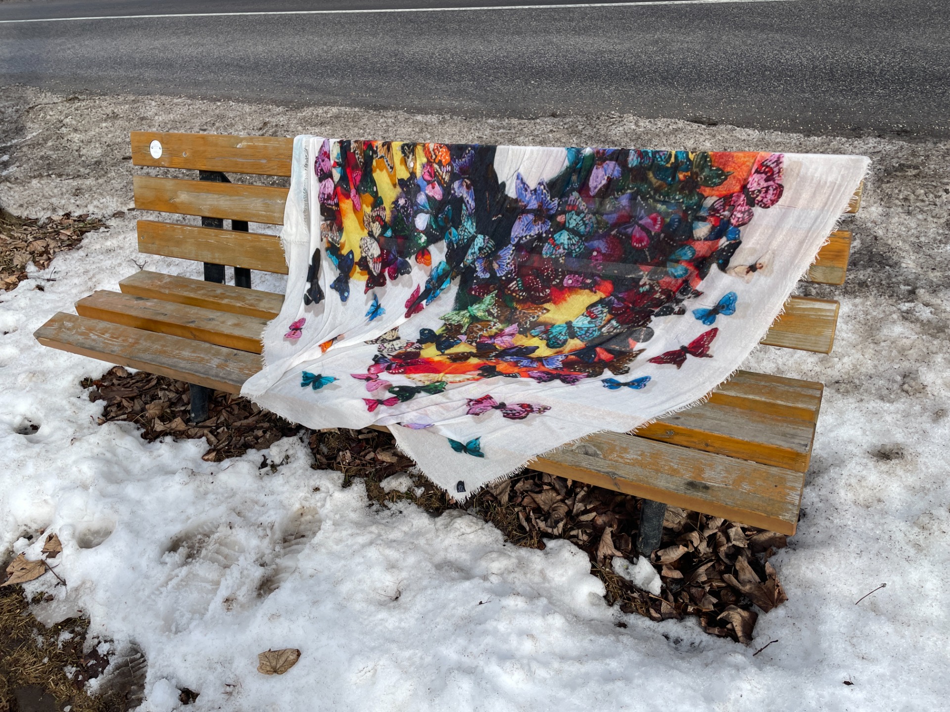 Lyžaři na lyže, chodci musí chodit! Obešla jsem jezero - a světe div se - můj kašmírový motýlí šátek byl nádherně rozprostřený přes zábradlí u jezera! Mokrý a špinavý, ale mám radost a posílám díky záchranci! (Tady už je to kus dál, kdy chvíli na lavičce odpočívám a šátek suším).