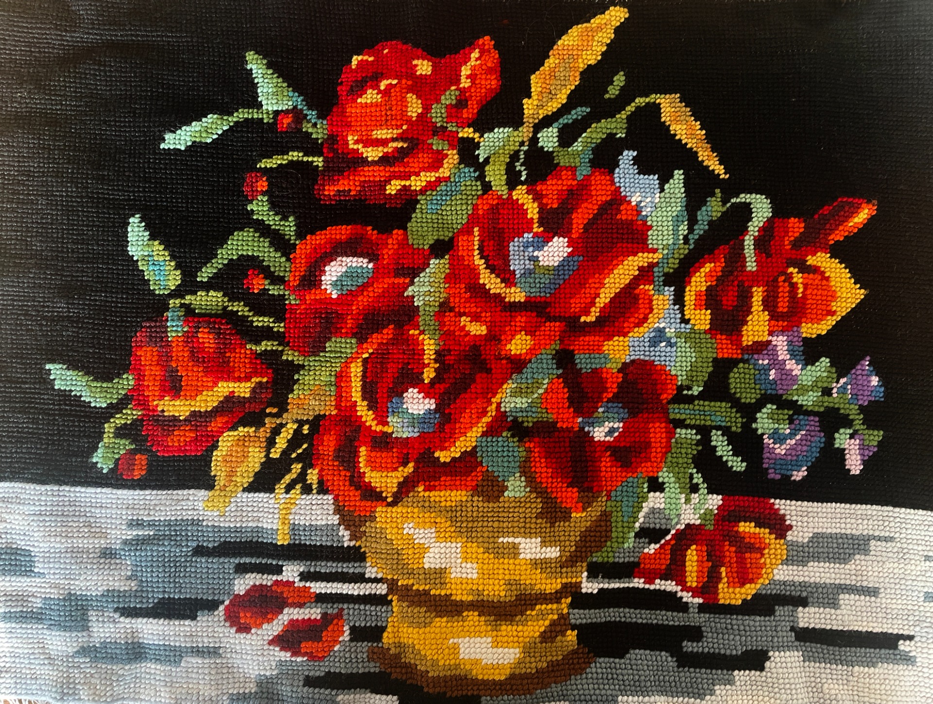 Na titulní fotografii vidíme maminkou vyšívaný obraz. Vyndala jsem ho z rámu, vyprala, teď nastane žehlení a mám ideu olemovat ho nějakou pěknou paspulkou a pak mohu vzniklou dečku dle chuti použít v bytě. Obraz na stěně nikdo z rodiny nechtěl, ale dát tu práci do popelnice - nikdy!
